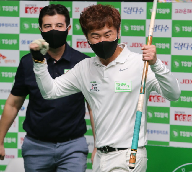 [브릴리언트 빌리아드=김철호 기자] 3일 강서구 메이필드호텔에서 열린 TS샴푸 PBA-LPBA 참피온십 2020 남자부 8강전에서 김현우선수가 북미 3쿠션 참피온인 피에드라부에나를 상대로 그리스의 3대1으로 역전승을 거두며 준결승에 진출했다. 5세트에서 역전승을 일궈낸 김현우선수가 환호하고있다<김철호기자>