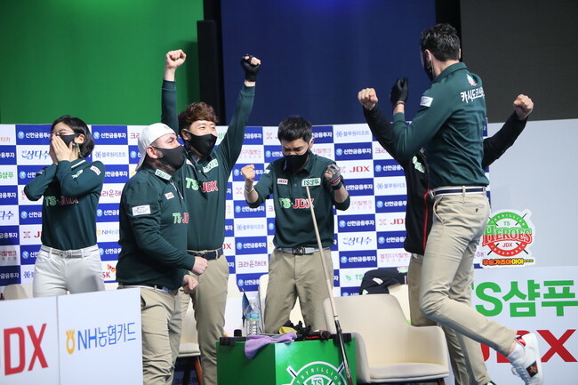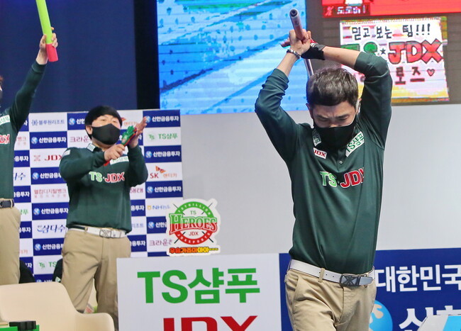 [브릴리언트 빌리아드=김철호 기자] 22일 고양 빛마루 방송지원센타에서 열린 PBA 파이널 5차전. TS.JDX 히어로즈와 웰컴저축은행 웰빙피닉스의 6세트. 3대2로 몰리던 TS.JDX 히어로즈의 주장 정경섭의 회심타로 승부를 원점으로 만들었다. 긴장김이 감도는 가운데 승부치기에서 들어선 두 팀간의 승리는 TS.JDX 히어로즈.