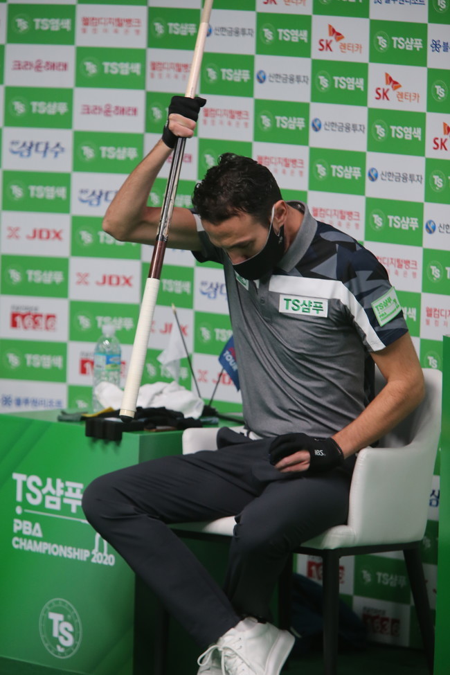 ▲ 카시도코스타스선수가 2세트에서 아쉽게 퍼펙트큐를 놓친후 큐를 내리치며 아쉬워하고 있다. |
