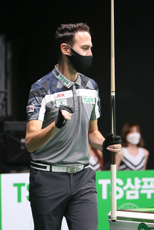 [브릴리언트 빌리아드=김철호 기자] 3일 강서구 메이필드호텔에서 열린 TS샴푸 PBA-LPBA 참피온십 2020 남자부 8강전 세번째경기에서 그리스의 카시도코스타스선수가 신병으로 경기를 출전 못하다 이번 대회에 참가 김봉철 선수와의 대전에서 3대1로 역전승 한 후, 환호하고 있다.