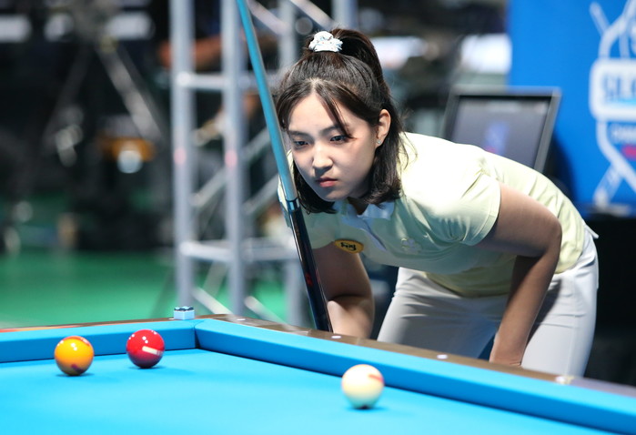 ▲이번대회 다크호스로 올라온 전지우가 오수정을 제치고 16강에 진출했다. 3세트 뱅크샷을 노린 전지우가 볼을 흐름을 지켜보고 있다 |