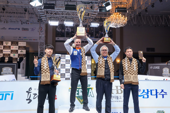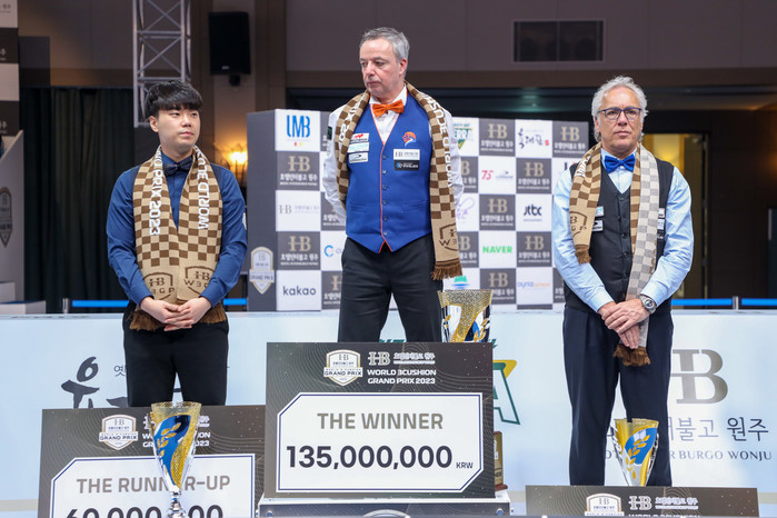 [Brilliant Billiards=김철호 기자] 역시 세계1위의 벽은 높았다. 3쿠션 ‘세계 최강’ 야스퍼스가 패자전에서 결국 1위에 올라 ‘산전수전’을 겪은 끝에 김행직을 꺾고 ‘월드3쿠션그랑프리’ 우승컵을 들었다. 지난 2021년 대회 우승에 이어 2연속 우승이다.딕 야스퍼스(네덜란드)는 1일 밤 강원도 원주시 원주인터불고호텔에서 열린 ‘월드3쿠션그랑프리 2023’ 최종 결승전(그랜드파이널)에서 김행직을 세트스코어 3:0(9:8, 12:7, 12:10)으로 제압했다.