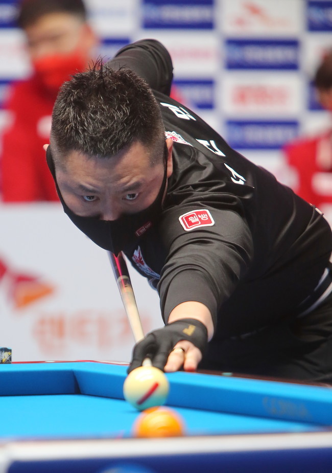 [브릴리언트 빌리아드=김철호 기자] 1일 고양 빛마루 방송센타에서 열린 신한금융투자 20-21 PBA 팀리그 4라운드 넷째날 첫번째경기 웰빙피닉스와 SK렌터카 경기에서 지금까지 한번도 이겨보지 못한 SK렌터카를 상대로 4대1로 승리하며 전팀 승리를 자리매김한 웰빙피닉스 남자 단식 서현민이 SK렌터카 김형곤을 상대로 마지막 두점짜리 뱅크샷을 친후 공의 움직임을 주시하고 있다.