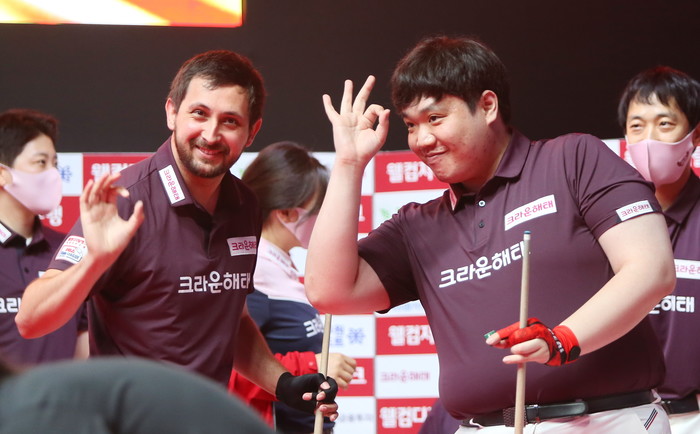 [Brilliant Billiards=김철호 기자] 19일 경기도 고양 빛마루방송센터에서 열린 ‘웰컴저축은행 PBA팀리그 2021-22’ 2라운드 6일차 경기, 휴온스와 크라운해태와의 경기에서 남자 복식에서 크라운해태 선지훈의 10점 하이런에 힘입어 휴온스를 8이닝 만에 15대7로 물리치고 첫세트를 승리했다.
