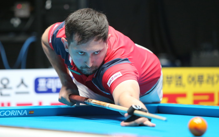[Brilliant Billiards=김철호 기자] 28일 경기도 고양시 빛마루방송센터에서 열린 휴온스 PBA 참피언십 32강전 스페인의 마르티네스와 일본의 모리의 경기에서 첫세트를 따낸 모리에게 분풀이하듯 마르티네스가 2이닝 퍼펙트큐에서 한점모자란 14점의 하이런으로 세트스코어 1대1을 만들었다.
