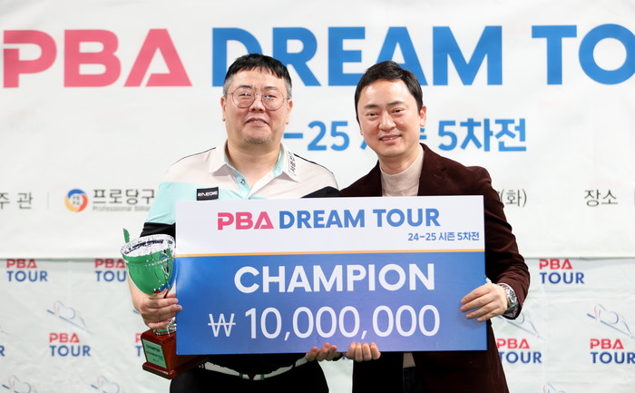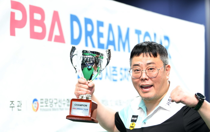 [Brilliant Billiards=김철호 기자] 유튜버 겸 프로당구 선수 김원섭이 PBA 드림투어(2부) 5차전에서 우승을 차지했다. 17일 경기도 고양시 ‘고양 킨텍스 PBA 스타디움’에서 열린 ‘2024-2025 PBA 드림투어 5차전’ 결승전서 김원섭은 이길수를 상대로 세트스코어 3:0(15:5, 15:9 15:12)으로 꺾고 정상에 올랐다. 이로써 김원섭은 상금 1,000만원과 랭킹 포인트 1만점을 추가하며 종전 드림투어 랭킹 76위에서 3위(1만 750점)로 수직 상승했다. 드림투어 포인트 랭킹 1위부터 20위까지는 차기 시즌 PBA 1부 투어로 승급한다.