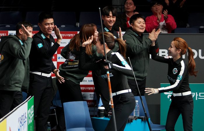 이후 하나카드는 3세트서 신정주가 레펀스에 10:15(6이닝), 김병호와 사카이 아야코(일본)가 조건휘-강지은에 7:9(9이닝)로 내리 패하며 세트스코어 1:3까지 몰렸다. 그러나 5세트에 나선 초클루가 강동궁에 11:6(5이닝)으로 승리하며 추격 발판을 마련했고, 이어 김가영이 6세트서 히다 오리에를 9:4(8이닝)로 물리치며 세트스코어 3:3, 7세트로 돌입했다. 결국 하나카드는 7세트서 ‘베트남 특급’ 응우옌꾸옥응우옌이 응오딘나이(베트남)를 맞아 하이런 7점을 쓸어 담는 활약으로 3이닝만에 11:8로 승리, 세트스코어 4:3 대역전 승리를 완성했다.