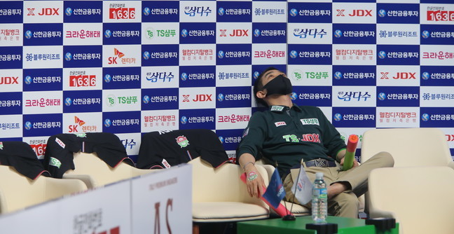 [브릴리언트 빌리아드=김철호 기자] 2020-21 PBA 팀리그 제4라운드 경기 TS,JDX 와 크라운 해태의 경기에서 마지막 보루 였던 자신의 남자 단식 경기가 패배하자 괴로워 하는 TS.JDX 팀리더 정경섭. 3라운드까지 무패를 달리던 TS.JDX가 4라운드 들어 패배가 늘어나자 리더 로서 책임이 무거워 힘들어 하고 있다