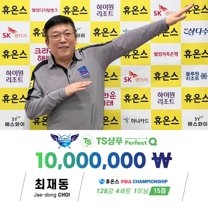 이번시즌 7번째이자 통산 29번째 퍼펙트큐를 달성자에 이름을 올린 최재동은 매 대회 가장 먼저 퍼펙트큐를 달성하는 선수에게 주어지는 특별상인 ‘TS샴푸 퍼펙트큐’(상금 1000만원)를 수상하게 됐다. ‘TS샴푸 퍼펙트큐’ 상은 매 대회 가장 처음으로 세트제 경기에서 상대 점수와 이닝에 관계없이 한 큐에 세트 모든 득점인 15점(LPBA는 11점, 마지막 세트도 포함)을 뽑아낸 첫 선수에게 상금 1000만원을 수여하는 특별상이다.