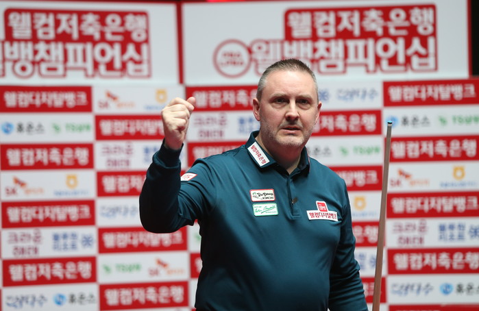 ▲ 개인통산 뱅크샷 500개를 기록한 쿠드롱이 다크호스 노병찬을 3대0으로 완승을 거두며 준결승전에 오르며 주먹을 쥐어 보이며 환호하고 있다 |