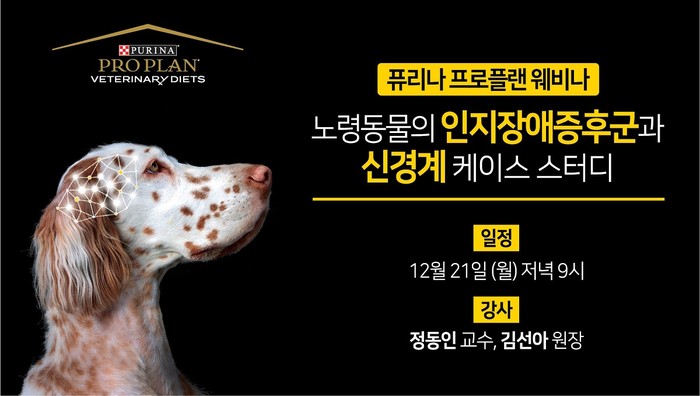퓨리나는 “많은 수의사분들의 긍정적 반응과 뜨거운 성원에 보답하고자 심화 세미나를 마련하게 됐다”며 “이번 웨비나를 통해 반려견들의 인지장애증후군과 신경계질병에 관한 실제 치료 사례를 자세히 다루고, 특히 영양학적으로 뇌 질환을 관리할 수 있는 식이 치료법에 대해 소개할 예정이다”고 밝혔다.