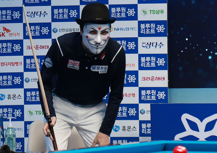 ▲독특한 복장으로 당구팬들의 시선을 한몸에 받고 있는 해커. 이번에 128강 문턱을 넘을 수 있을지 |