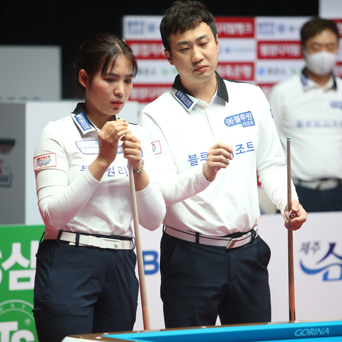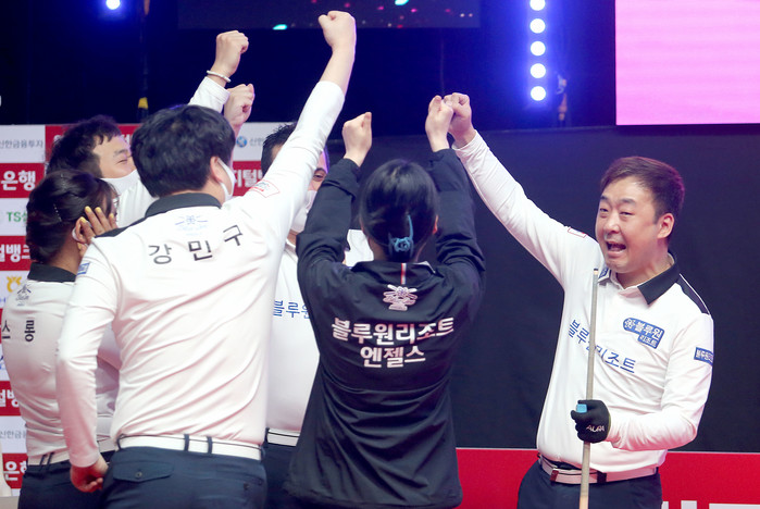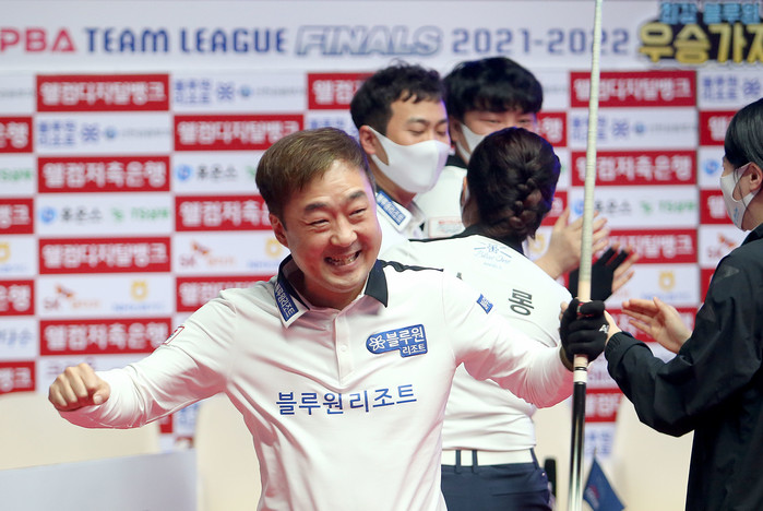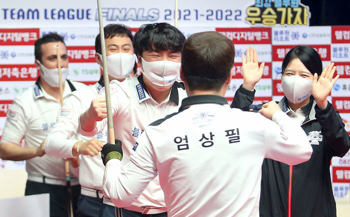 [Brilliant Billiards=강경석 기자] 엄상필의 활약에 힘 입어 블루원리조트가 승부치기 끝에 웰컴저축은행을 꺾고 파이널 첫 승을 따냈다. 주장으로서 ‘엄상궁’ 별명을 얻은 엄상필은 ‘엄중전’을 넘어 ‘엄황제’로 등극했다. 14일 오후 경기도 고양시 빛마루방송센터에서 열린 ‘웰컴저축은행 PBA팀리그 2021-22’ 파이널 1차전서 블루원리조트가 승부치기까지 돌입하는 접전 끝에 웰컴저축은행을 꺾었다. 특히 승부치기 마지막 주자로 나선 엄상필이 3득점에 성공하며 역전승을 완성했다.