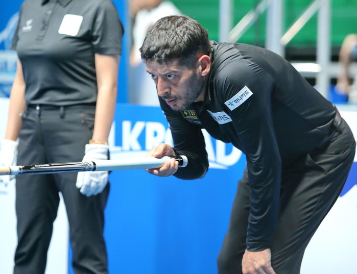 ▲ 첫승을 거두며 64강에 진출한 터키 쵸클루가 뱅크샷 라인을 살피고 있다 |