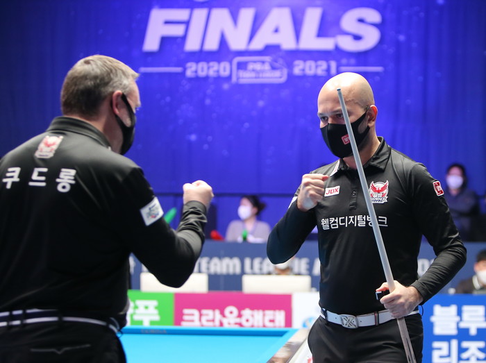 [브릴리언트 빌리아드=김철호 기자] 22일 고양 빛마루 방송센타에서 열린 PBA 파이널 6차전 TS.JDX히어로즈 와 웰컴저축은행 웰빙피닉스의 1세트 남자복식경기에서 웰컴저축은행 웰빙피닉스는 최강 쿠드롱과 위마즈를 투입하여 승기를 잡으려 오더를 냈고 TS.JDX히어로즈는 외국인선수들을 후반으로 몰아 후반 승기를 잡으려 배치하였다.