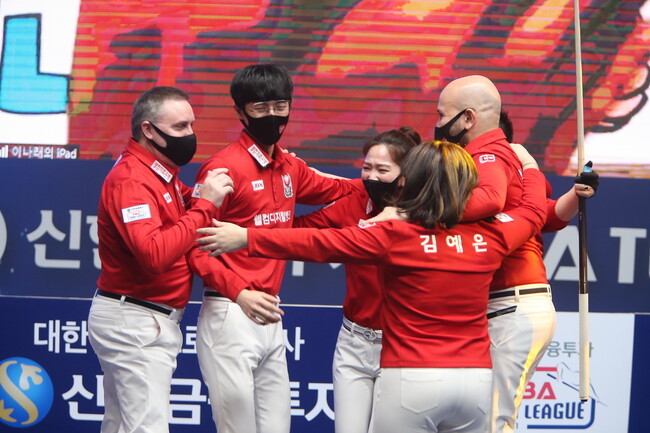 ▲ 웰컴저축은행이 팀리그 5라운드 마지막 TS.JDX를 누르고 1위를 차지하며 환호하고 있다 |