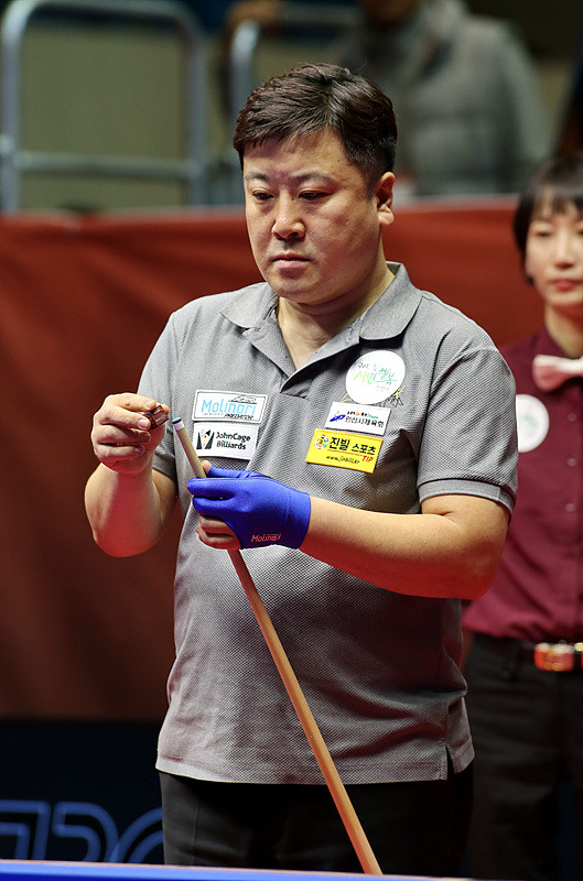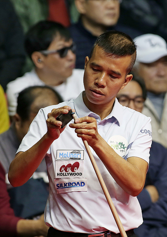 베트남의 트란퀴엣 치엔선수가 경기전 큐를 정비하는 모습