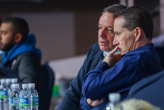 ▲원주 인터불고 호텔에서 열리고 있는 월드 3 쿠션 그랑프리 2023 개인전이 펼쳐지는 경기장에서 세계 랭킹 1위 딕야스퍼스와 9위 에디먹스가 다른 조의 선수들 경기를 지켜보며 귀엣말을 나누고 있다<사진제공=파이브앤식스>
